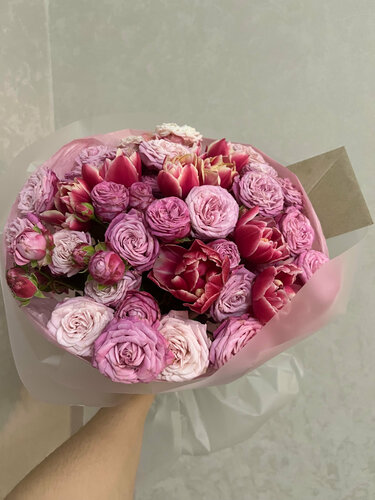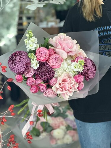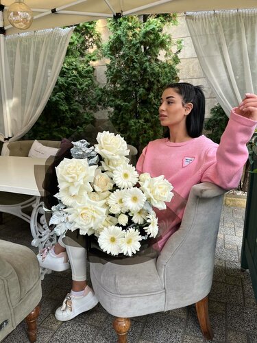 Букет суперский, очень красивый. Брали в сильный ветер - укутали в дополнительную пленку, чтобы ничего не пострадало от непогоды, флористу спасибо за такую заботу